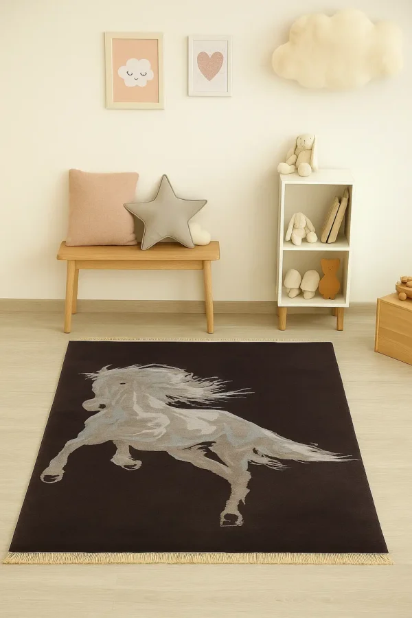 For a kid’s room: The powerful yet beautiful image of the horse can inspire imagination and add a sense of adventure to the space. The durable wool material is suitable for a high-traffic area.