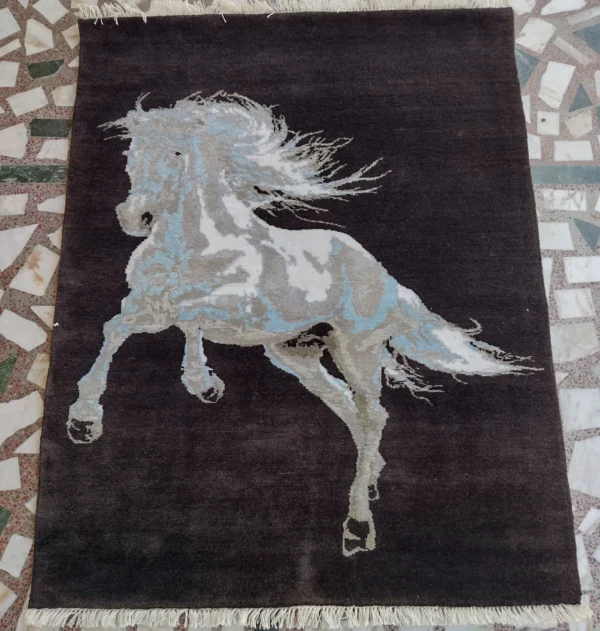The rug features a central image of a dynamic, stylized horse in motion, seemingly rearing up or galloping. The horse is depicted with a flowing mane and tail, suggesting movement and wildness. The color palette for the horse is a mix of black, white, and subtle hints of a light, icy blue, which adds a cool, artistic touch. This striking design makes it a captivating focal point.