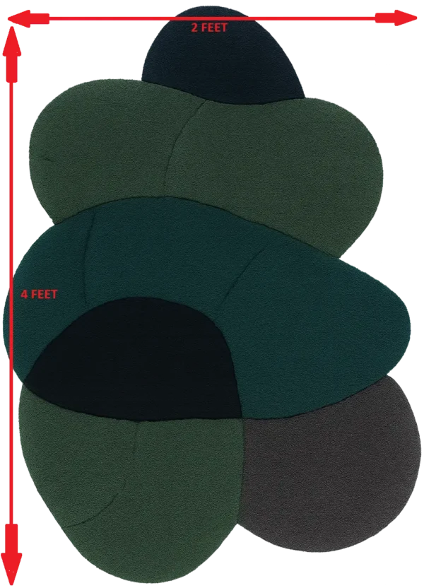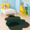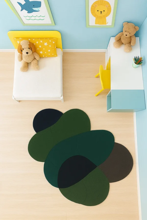 This rug features an organic pebble-inspired pattern, with overlapping rounded shapes in rich, earthy tones of deep green, teal, navy, and charcoal gray. The abstract form is calming yet playful, making it perfect for stimulating creativity while keeping the space stylish. Its nature-inspired palette balances perfectly with both vibrant kids’ décor and soft pastel rooms.