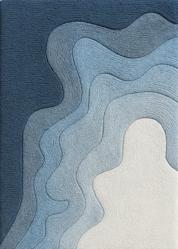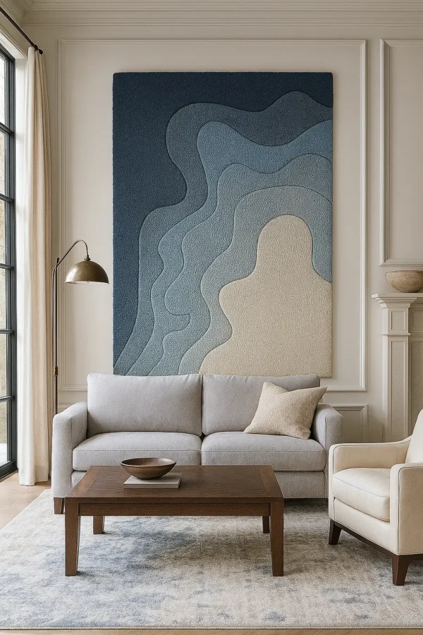 Bohemian (Boho): While the rug is not a traditional “boho” pattern, its textural quality and artistic, abstract form could fit into a more modern or refined bohemian space. It could be used to ground a room with more eclectic furniture and decor, providing a calm, watery base for a mix of textures and colors.