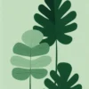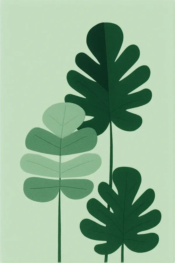 Leaves: The three main leaf motifs are depicted in a darker green palette. One frond on the left is a lighter, more muted green, while the two on the right are a deeper, richer forest or hunter green. This variation in color adds depth and visual interest to the design.