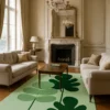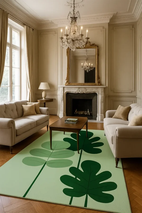 This rug would be a striking focal point in a living room, bedroom, or kids room. Its calming colors and natural motif would complement spaces dedicated to relaxation and creativity. The rectangular shape shown makes it versatile for placement under a coffee table, at the foot of a bed, or as a centerpiece in a seating area.